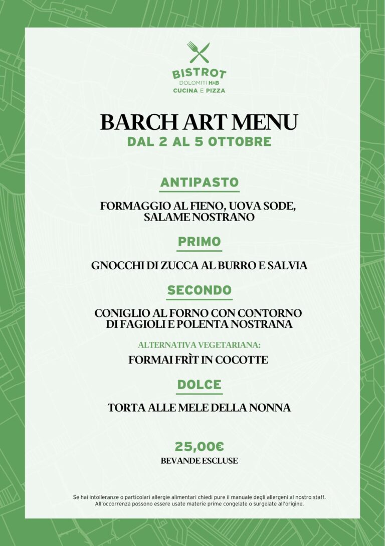 sarà possibile gustare presso il Bistrot di Dolomiti Hub il Barch Art Menu, un menu degustazione su prenotazione a base di prodotti legati al fieno e alle produzioni locali.